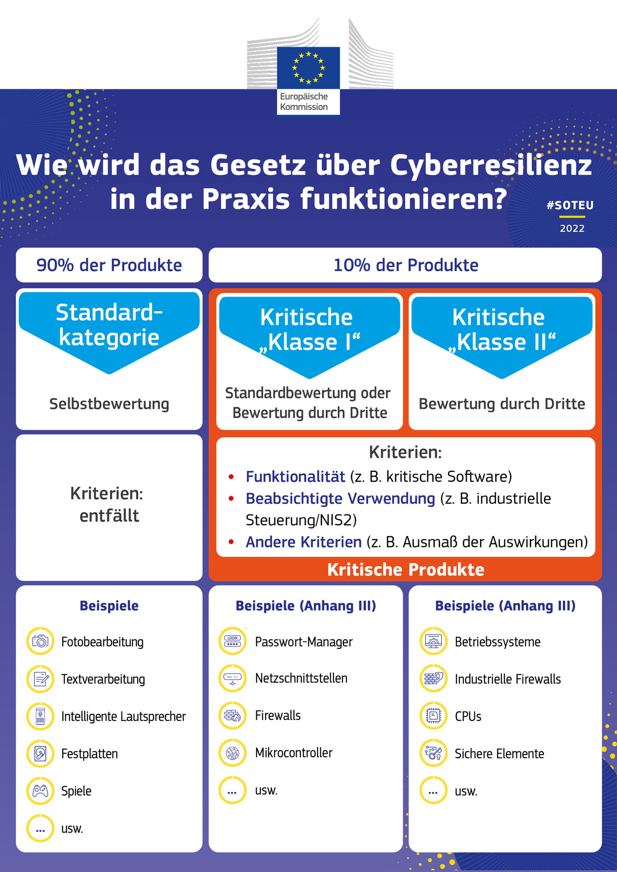 Nach dem Inverkehrbringen der Produkte auf dem EU-Markt müssen deren Hersteller mindestens fünf Jahre lang eine Sorgfaltspflicht erfüllen. Der CRA deckt eine breite Palette von Hardware und Software ab. Für alle Produkte gelten dieselben Anforderungen an die Cyber-Sicherheit, aber die Art der Konformitätsbewertung wird an das jeweilige Risikoniveau angepasst.