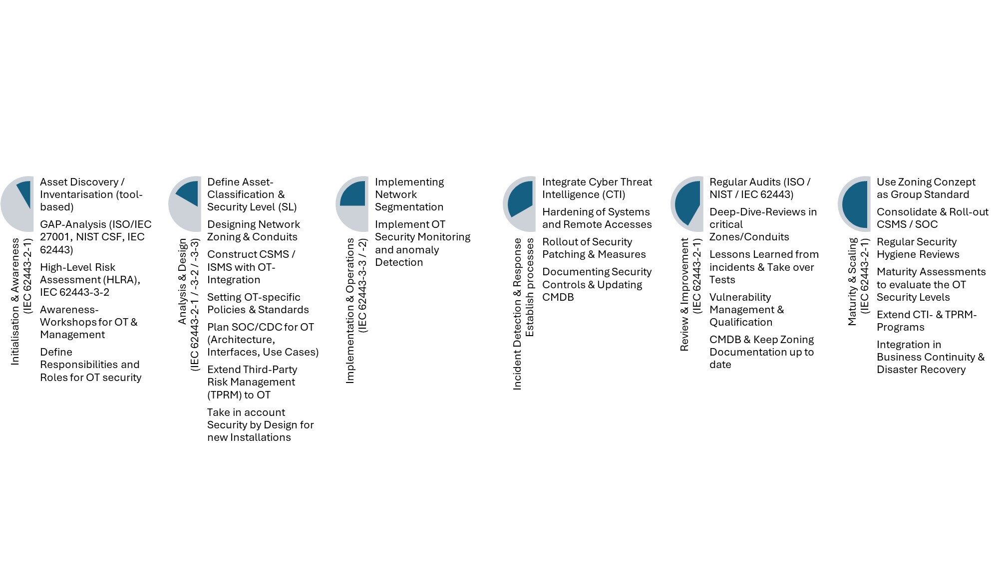 The following roadmap, which is based on the standard, shows how this approach can be implemented in practice: from the initial assessment to the continuous development of OT security.