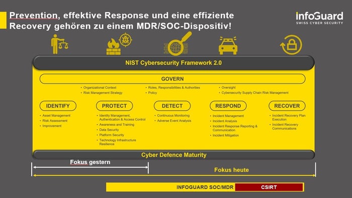 In the context of cyber defence, the use of a comprehensive NIST Cybersecurity Framework 2.0 (MDR/SOC dispositive) is essential for the safeguarding of all essential security aspects. In other words, a balanced combination of identification, protection, detection, response and recovery forms the basis for effective cyber defence and protects against potential damage and business-relevant effects.